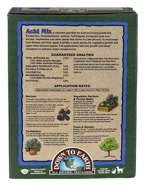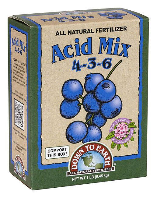 Down To Earth’s Acid Mix 4-3-6 is a fertilizer blended for plants that thrive in a low pH soil like blueberries and raspberries, rhododendrons, azaleas, hydrangeas, evergreen trees and shrubs. To encourage lush flowers and fruit, apply DTE Acid Mix 4-3-6 in early spring for vegetative growth and again when blooms appear. Fall applications promote root growth and boost resistance to extreme winter temperatures.