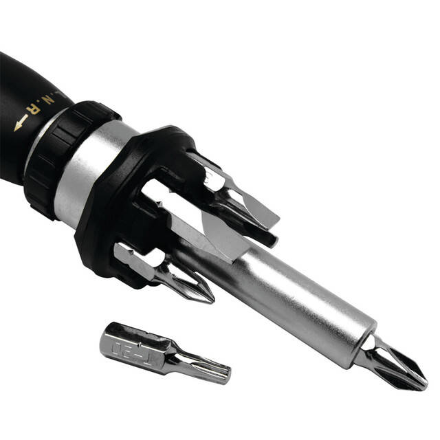 High torque ratchet screwdriver that includes a variety of bits. Features forward, reverse and lock positions.