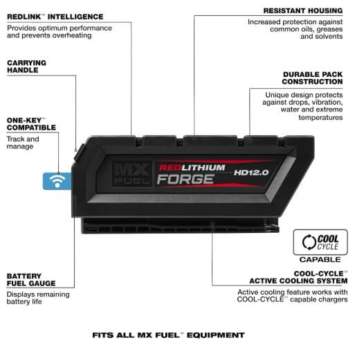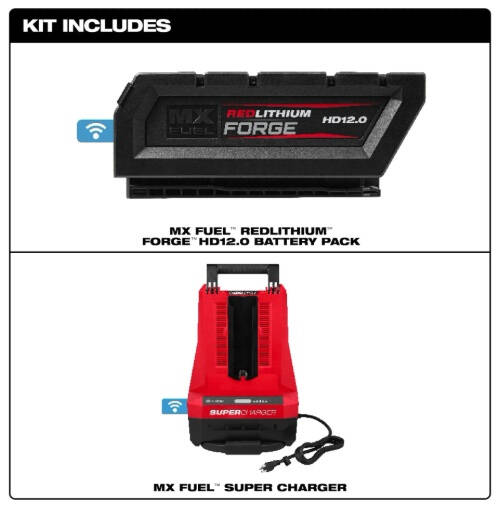 | Includes | Kit Includes: (1) MX FUEL™ REDLITHIUM™ FORGE™ HD12.0 & (1) MX FUEL™ Super Charger |