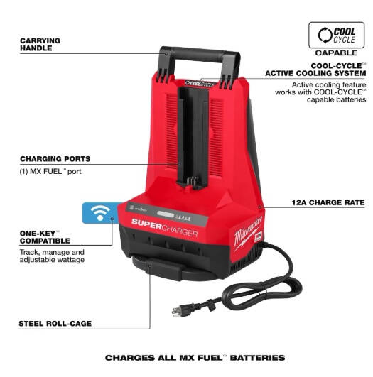 Our MX FUEL™ REDLITHIUM™ FORGE™ HD12.0 BATTERY/SUPER CHARGR EXPANISON KIT delivers a 65min charge time to 100% to maximize your productivity. Super Chargers are Milwaukee’s fastest chargers, providing you with the fastest charge times on your MX FUEL™ REDLITHIUM™ batteries. REDLITHIUM™ FORGE™ are Milwaukee’s most powerful, fastest charging, and longest life batteries. The REDLITHIUM™ FORGE™ HD12.0 delivers 2X more runtime vs. MX FUEL™ REDLITHIUM™ XC406 (XC6.0), allowing you to deliver more work per charge and run your equipment longer than ever before. The MX FUEL™ REDLITHIUM™ FORGE™ HD12.0 & MX FUEL™ Super Charger are both COOL-CYCLE™ Capable. COOL-CYCLE™ Active Cooling System provides high-speed cooling for less downtime. The active cooling feature works with MX FUEL™ batteries and chargers that have COOL-CYCLE™ capability. Both the REDLITHIUM™ FORGE™ HD12.0 and Super Charger are ONE-KEY™ compatible for tracking, management, and the charger includes an adjustable wattage feature to maximize outlet power on site. Both battery and charger features REDLINK™ Intelligence and communicates cell voltage, temperature, and charge status to optimize the performance. Both battery and charger have full compatibility with the entire MX FUEL™ Equipment System.