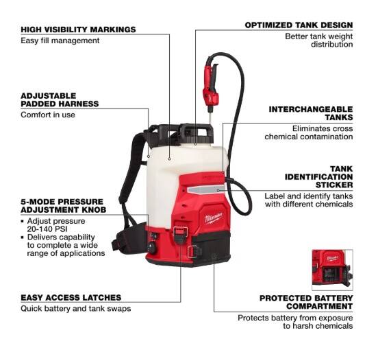 Our M18™ 4-Gallon Backpack Sprayer w/ SWITCH TANK™ delivers the industry's best pressure control with no manual pumping and an interchangeable tank design. Designed to meet the needs of professional landscape maintenance, the battery-powered backpack sprayer provides instant, constant, and adjustable pressure up to 140 PSI and a 24 ft vertical spray distance. The 5-mode flow rate knob adjusts the flow by 0.1 – 0.52 GPM, giving you the capability to complete a wide range of applications. The 4-Gallon Sprayer Tank Assembly features a dual diaphragm pump for longer pump life and Viton® seals for increased durability against harsh chemicals. The sprayer tank has an optimized design for better weight distribution, a wide mouth opening for easier pouring, and a strainer that filters debris from getting into the tank. The backpack frame includes padded straps, lumbar support, and a hip belt, giving you added comfort during extended spraying applications. The 4-Gallon Sprayer is made up of two components – the M18™ Powered Base and the 4-Gallon Sprayer Tank Assembly. The Powered Base includes the motor, battery compartment, and REDLINK™ electronics, while the interchangeable Tank Assembly includes the pump, hose, and wand. The isolated pump, hose, and wand design allows you to add on tank assemblies for different spraying applications, eliminating cross-chemical contamination.