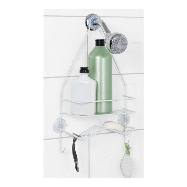 Organize your shower instantly with this easy to install rust-proof showerhead caddy. It provides storage for bottles, shower puffs, razors and more. Slip-proof collar and suction cups are included to secure caddy. 10 in W x 17-3/4 in H x 3.63 in D.