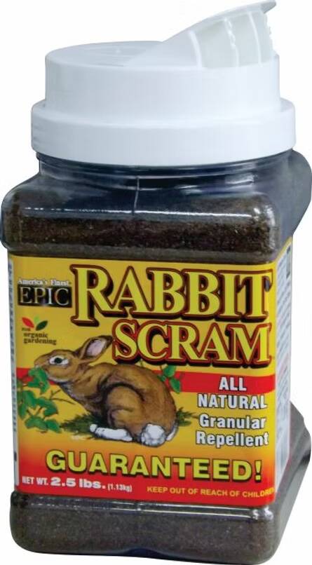 | Recommended Application | Rabbit Scram can be applied as a protective perimeter strip or it can be evenly spread over a garden bed or flowerbed. Rabbit Scram will shield your flowers, shrubs, trees, ornamentals, vegetable gardens, forests, vineyards, orchards, field crops and nursery stock when used as directed and consistently applied every 30-45 days. |
