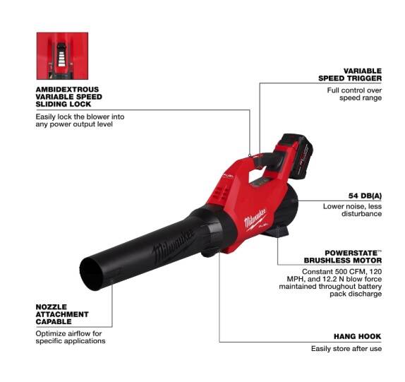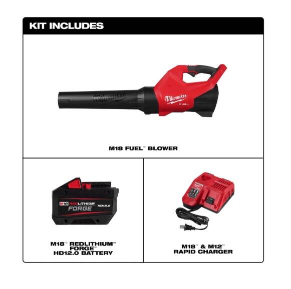| Includes | (1) M18 FUEL™ Blower (1) M18™ REDLITHIUM™ FORGE™ HD12.0 Battery Pack (1) M18™ & M12™ Rapid Charger |