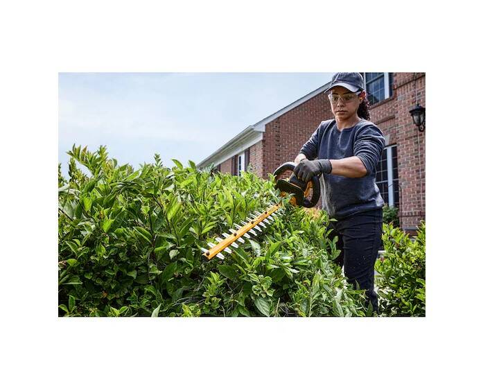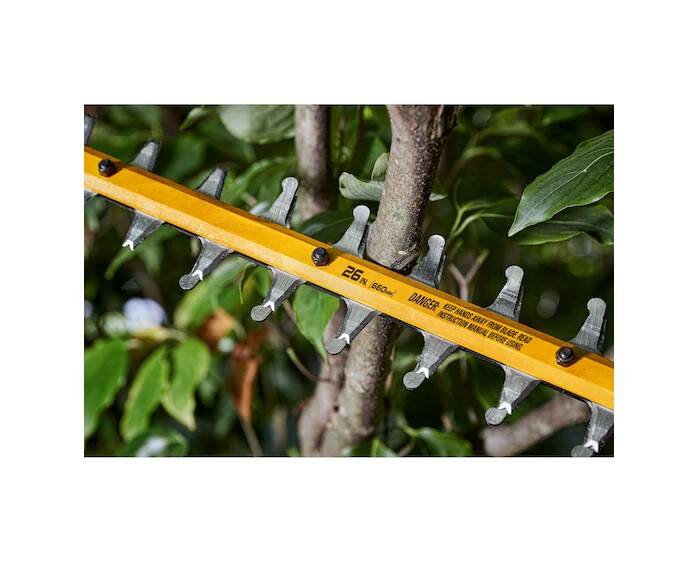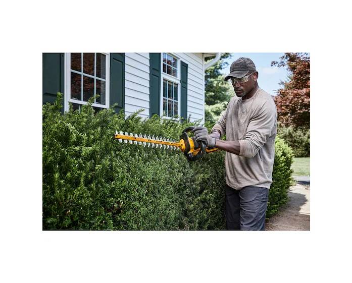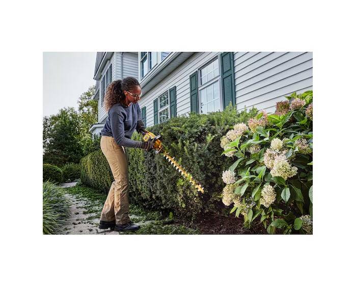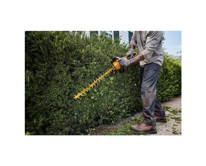 Keep your yard and garden area in top shape with this 60V MAX* 26 in. Brushless Cordless Hedge Trimmer. Quickly cut overgrowth and small branches with the Hedge Trimmer"s brushless motor that delivers up to 3,400 strokes per minute. The long-lasting, 26 in. hardened steel blade was built for durability. Its blade gap of 1-1/4 in. and dual shear edges offer consistent, professional-level performance. For less hand strain, use the wrap-around auxiliary handle to work comfortably at different angles.