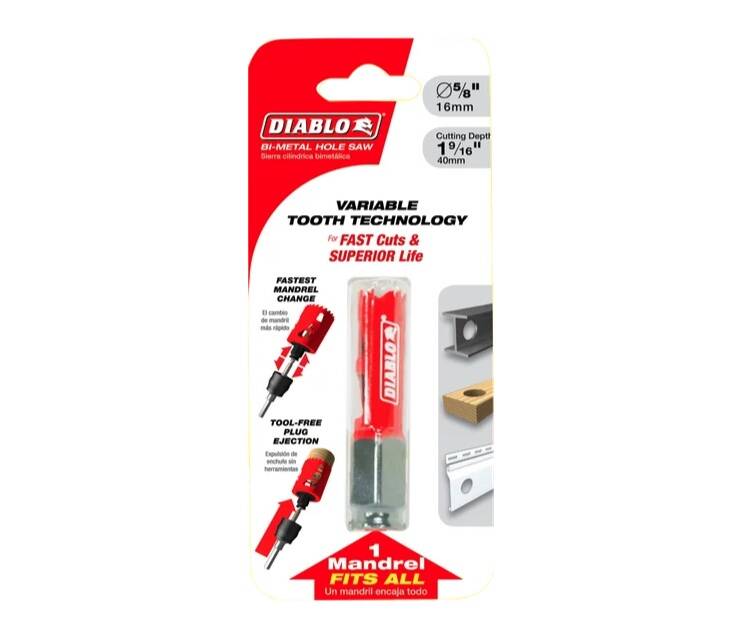 Diablo’s new, high-performance Bi-Metal Hole Saws deliver faster cutting performance and increased productivity. Unlike anything on the market, Diablo’s hole saw system and mandrel design simplify the attachment process for fast and efficient hole saw mounting. These radical new hole saws provide ultimate cutting length to bore deeper holes in a single pass, tool-free plug ejection and Variable Tooth Design for faster cuts.