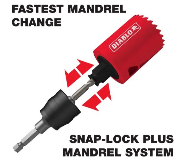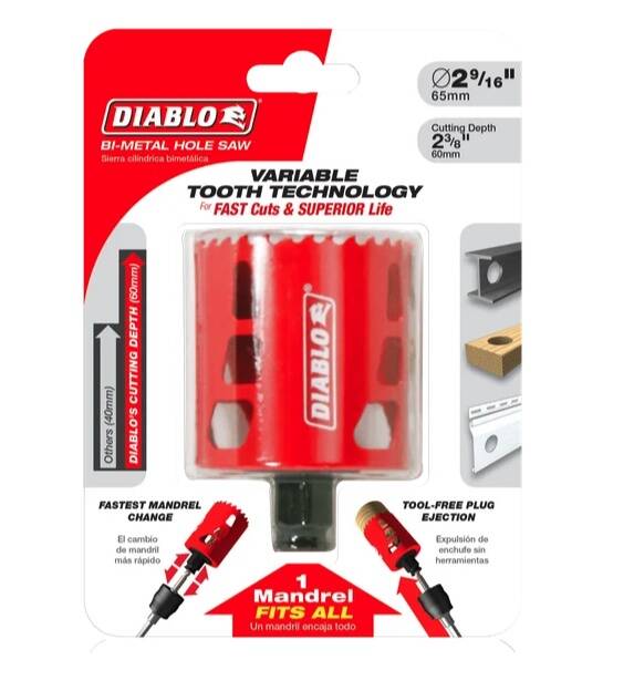 Diablo’s new, high-performance Bi-Metal Hole Saws deliver faster cutting performance and increased productivity. Unlike anything on the market, Diablo’s hole saw system and mandrel design simplify the attachment process for fast and efficient hole saw mounting. These radical new hole saws provide ultimate cutting length to bore deeper holes in a single pass, tool-free plug ejection and Variable Tooth Design for faster cuts.