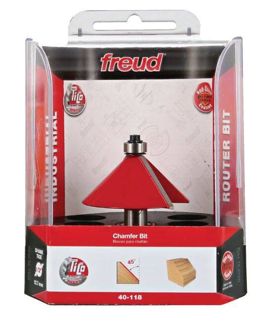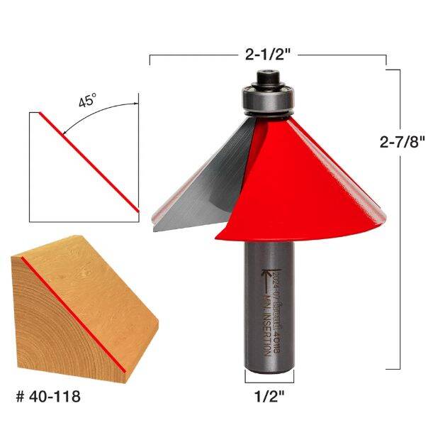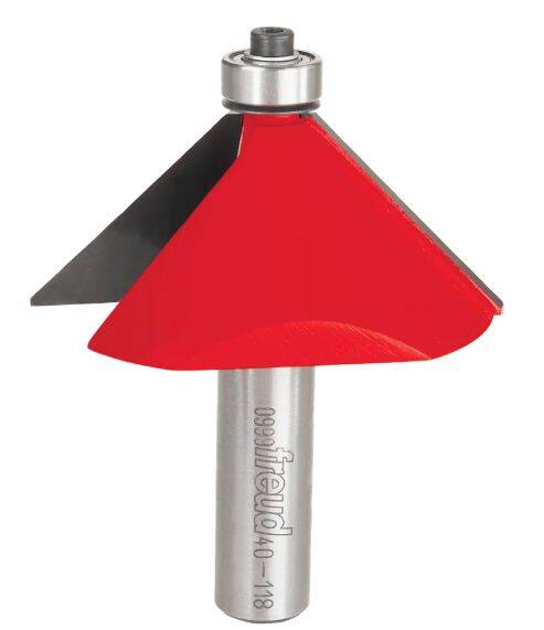 The chamfer profile seems simple, but it is a great solution for lots of multiple-sided projects, joinery, and easing edges. Creates a uniform chamfer on the edge of any work piece to add character, while retaining crisp geometric lines. #40-094 makes 16-sided pieces and #40-098 makes 12-sided pieces. Routs hardwood, softwood, plywood and composites; use in hand-held or table-mounted portable routers.