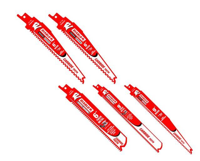 Diablo's Steel Demon™ and Demo Demon™ Carbide Teeth Reciprocating Blade Set consists of three Demo Demon blades for nail-embedded wood and two Steel Demon blades. This carbide teeth reciprocating saw blade set allows PROs to blaze through multiple materials, including nail-embedded wood, clean wood, cast iron, high strength alloys, stainless steel, tubing and more wood amazing ease. Get faster wall teardowns and framing materials or slice through a variety of metal pipes, bars and beams up to 9/16". Diablo's High performance TiCo™ Hi-Density carbide delivers an unmatched up to 50X longer blade life than standard bi-metal blades. Thanks to an oversized 1" body height, the blades provide greater durability, straighter cuts and less vibration across all cutting applications.