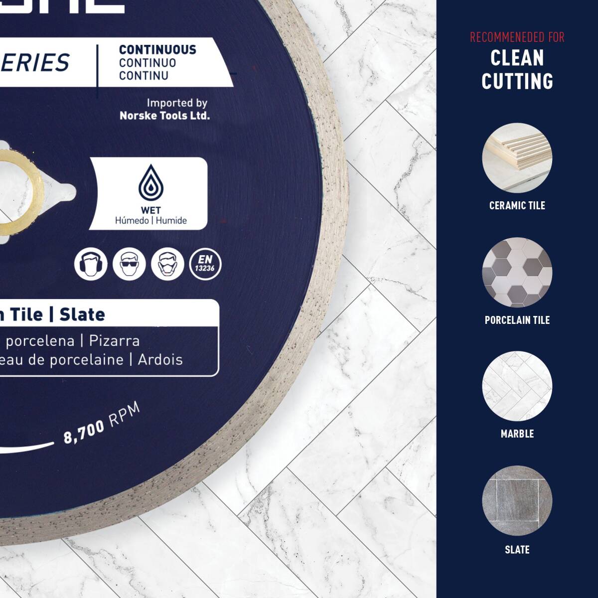 • Continuous rim design provides the smoothest of cuts with minimum chipping in hard materials such as ceramic tile, porcelain and granite.