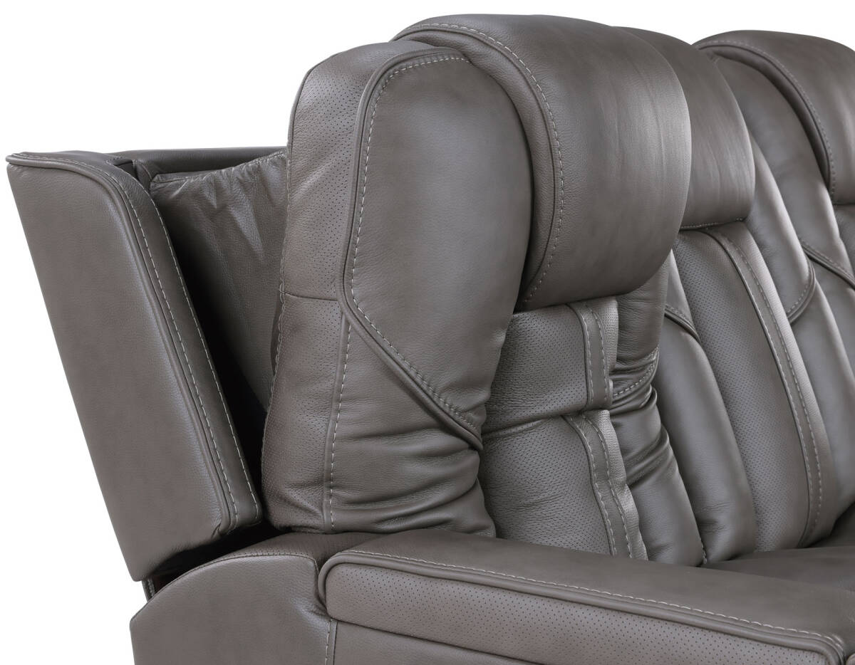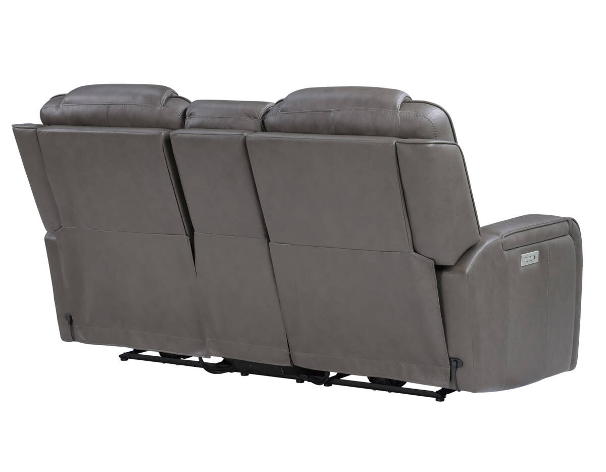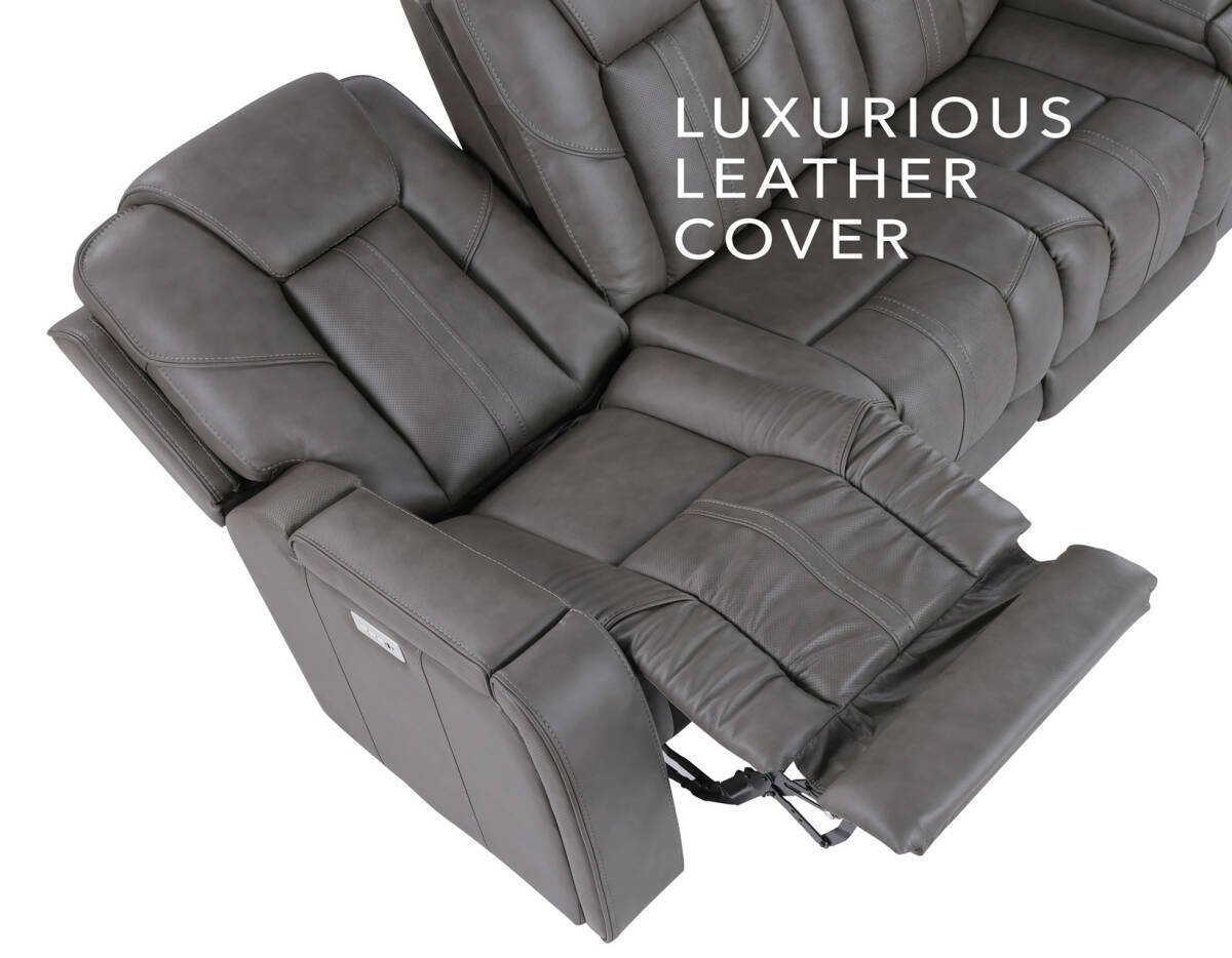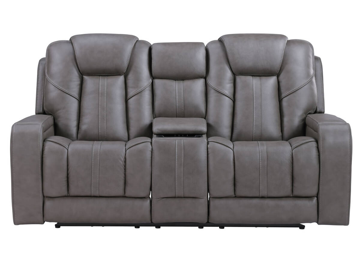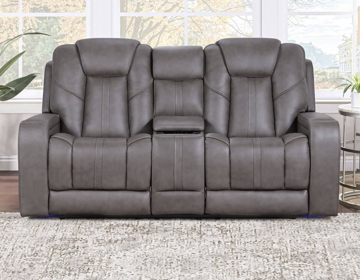 Enjoy the ultimate blend of luxury, comfort, and high-tech entertainment with the Daniel Triple-Power Leather Reclining Immersive Entertainment Console Loveseat.