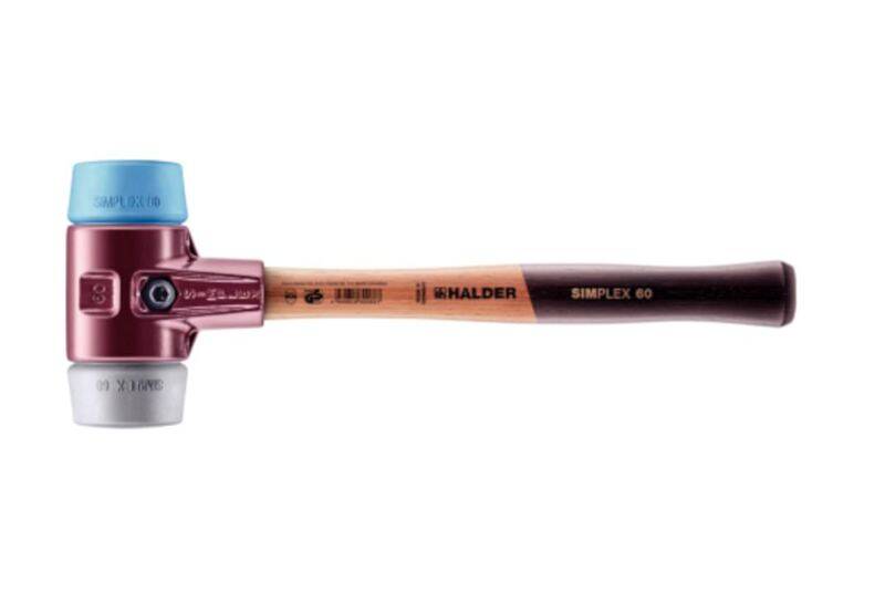 - SIMPLEX soft-face mallet with the insert combination of TPE-soft (blue, soft, non-marring) / TPE-mid (grey, medium hard, non-marring).