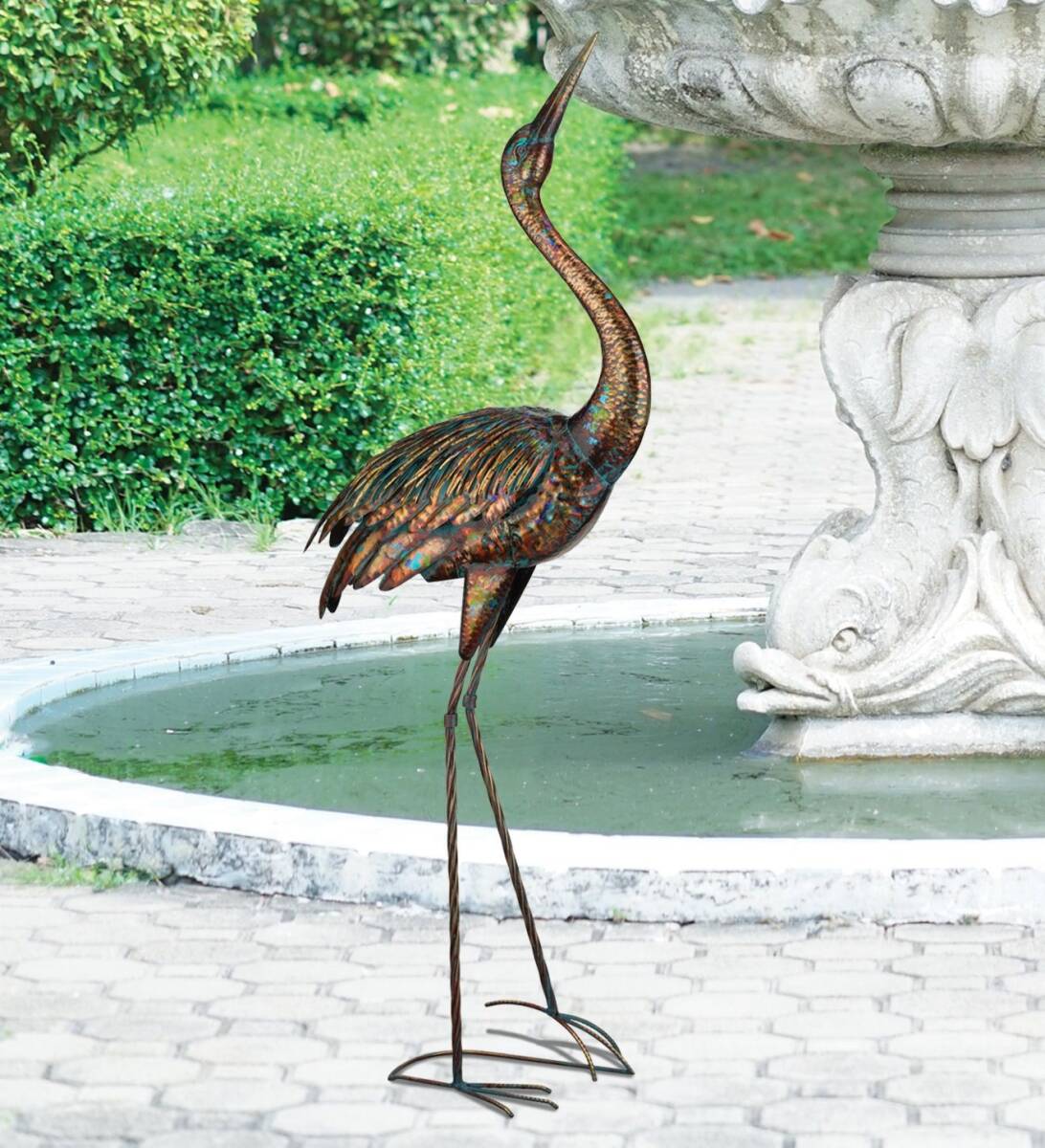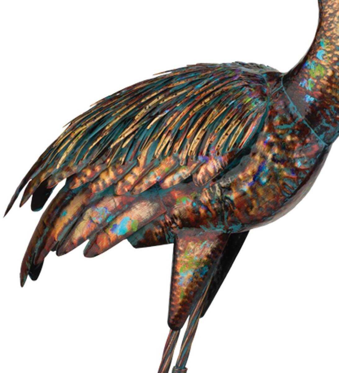 Large Crane sculpture with a shimmering, iridescent surface that reflects a stunning range of colors, from deep blues and greens to vivid purples and golds. This unique finish creates a rainbow-like effect that glimmers in the light.