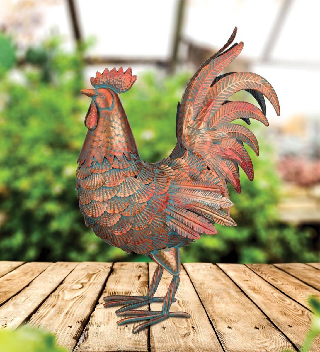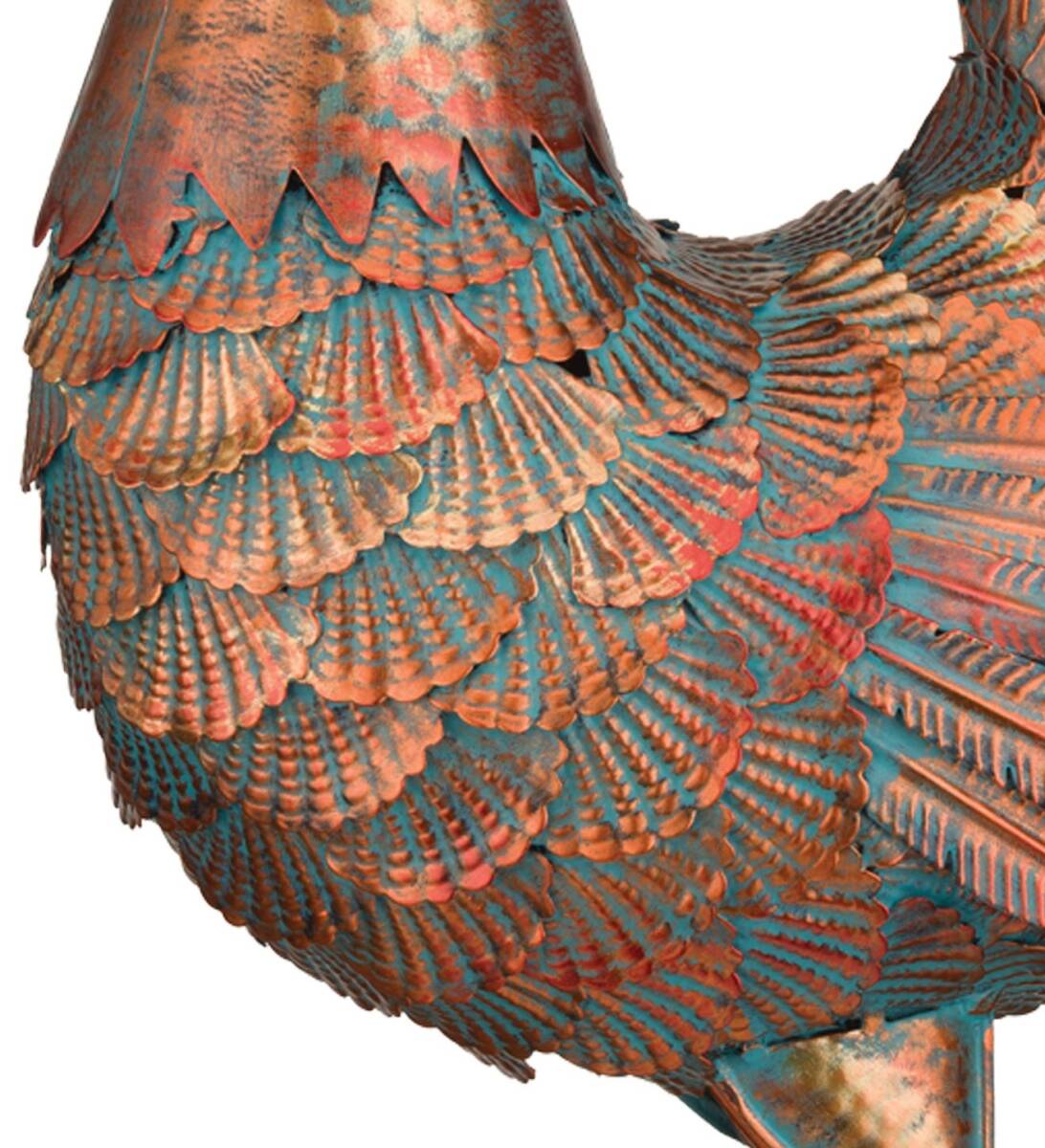 Crafted from durable metal and finished in a classic copper patina finish, this stunning Rooster shimmers in shades of copper and teal. With intricate detailing and a stylized metallic finish this Rooster will serve as stunning home accent.
