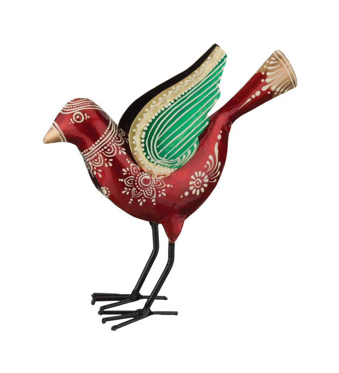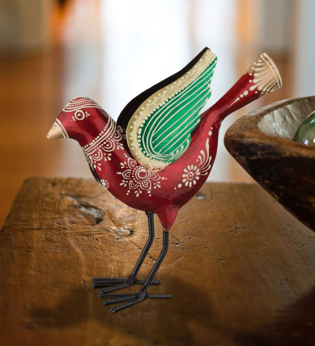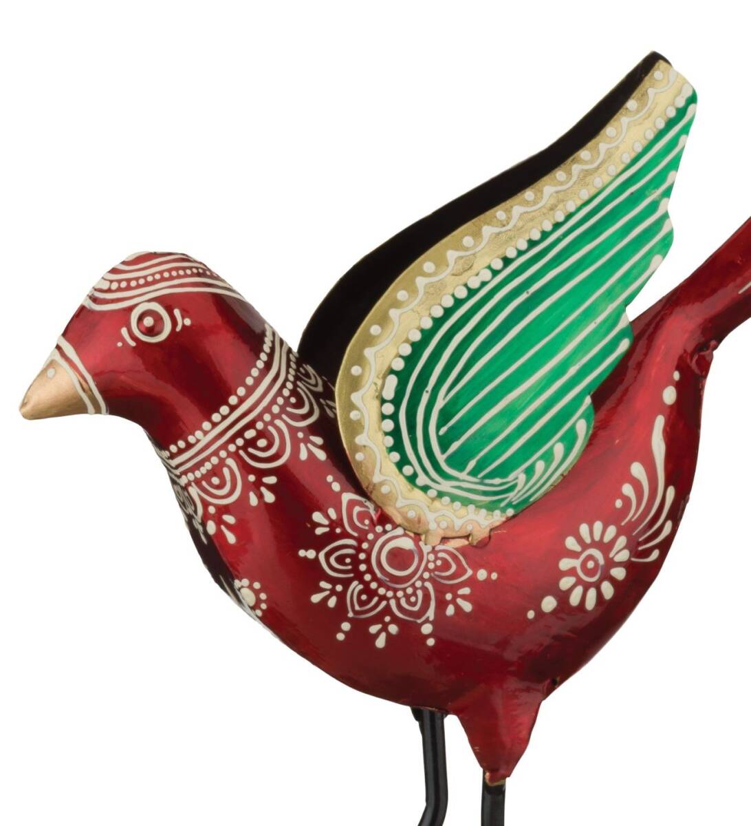 This special Henna Bird Decor is hand crafted and painted by special artisans in India who specialize in a painting style similar to the popular 'Henna' style body painting used for weddings and ceremonies. Intricate details and rich colors make this item unique. These life-size little birds are colorful and adorned with thick white impasto designs. A truly handmade piece with hundreds of brushstrokes on each bird.