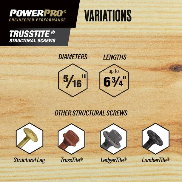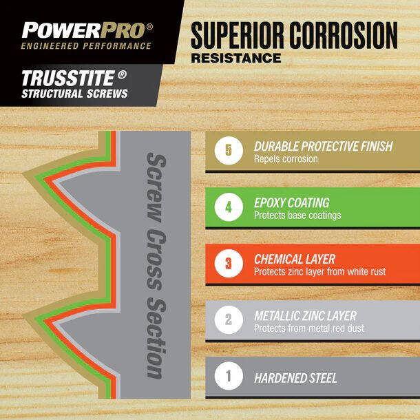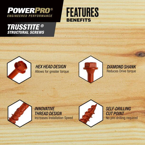 Power Pro® TrussTite® Structural Wood Screws boast a corrosion-resistant coating that ensures exceptional durability, even in the most challenging environments. With their innovative thread pattern and self-drilling tip, these screws offer a faster install vs. standard lag screws, install 30% faster than leading competitive ledger screws, and require no pre-drilling. Drive more screws per battery charge. Offering higher pullout values means you get a stronger, more secure hold.