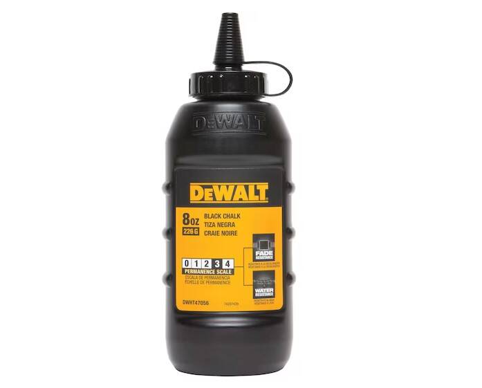 DEWALT® 8 oz. black chalk features an oval shaped bottle that will not roll off work surfaces and an easy pouring tethered opening.