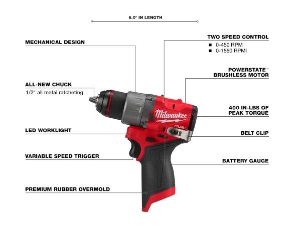 Our M12 FUEL™ 1/2" Drill/Driver is the Most Powerful Subcompact Drill Driver, the Most Compact in size, and provides the Fastest Speed Under Load. The POWERSTATE™ brushless motor delivers the most power for the capability to perform the widest variety of applications at high speed for unrivaled subcompact performance. At only 5.9" in length, this portable drill is the shortest solution in class offering most access into tight spaces. Our REDLINK PLUS™ Intelligence delivers top of the line thermal performance to give our users the Fastest Speed Under Load in order to drill and drive faster than any other subcompact drill. Using our M12™ REDLITHIUM™ 2.0Ah compact and 4.0Ah extended capacity battery packs will deliver more work per charge and more work over the life of the pack than competitive batteries. Our all-metal 1/2" chuck and all-metal gearcase deliver best-in-class durability. The mechanical clutch delivers consistent torque for driving fasteners. Our M12 FUEL™ 1/2" Drill Driver is part of the M12™ System which is fully compatible with over 125 solutions.