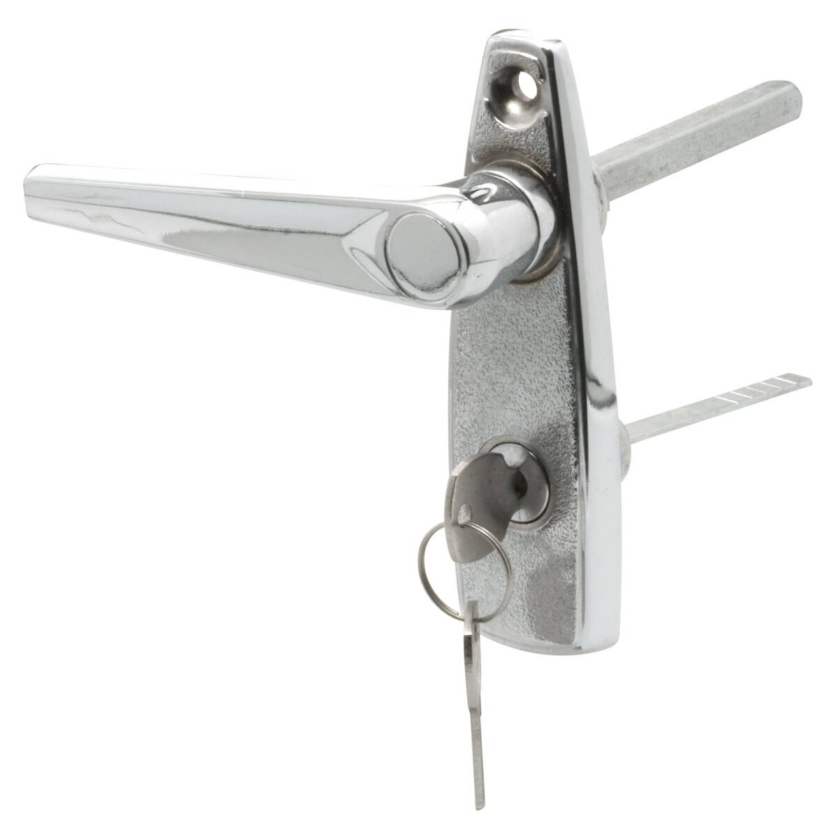 L- Handle and Locking Unit, 5/16-inch Square Shaft, 3-1/8-inch Long Plated diecast handle and housing with 5/16-inch square shaft, 3-1/8-inch long; keyed lock with break-off spindle; works with GD-12138 slide lock. You may wish to stock this related part: GD-52138.