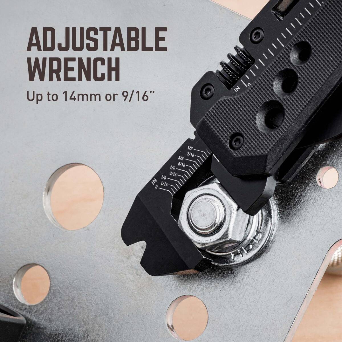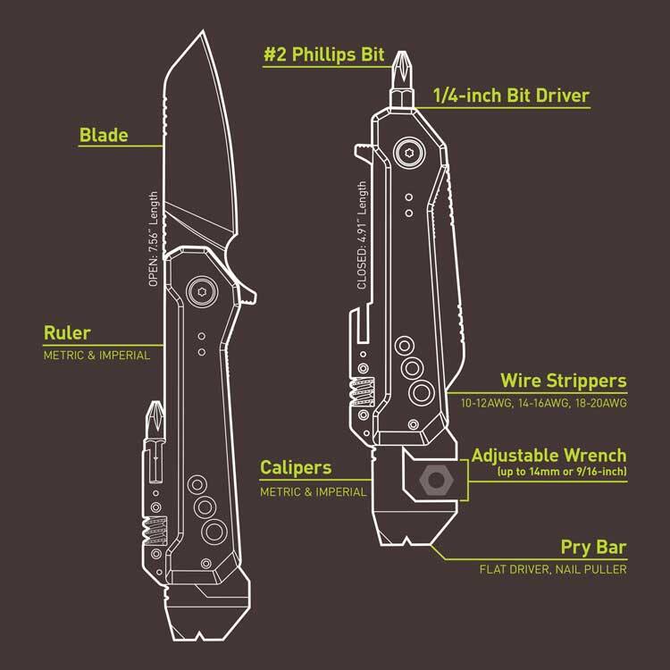 The SMARTKNIFE WR features a 2.5” black oxidized Sheepsfoot blade cleverly wrapped in an assortment of multi-tools. This 8-in-1 multi-tool knife is equipped with an adjustable wrench, calipers, magnetic 1/4” bit driver, wire strippers, rulers, flat driver, and a pry bar, making this the smartest knife you can put in your pocket.