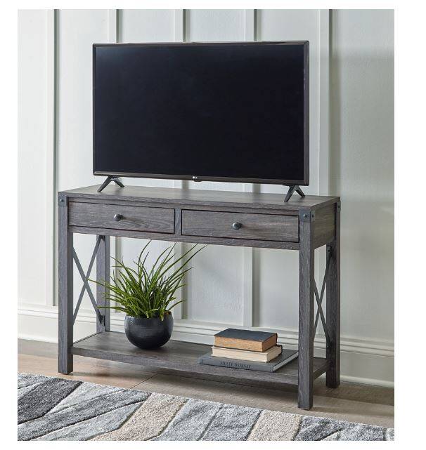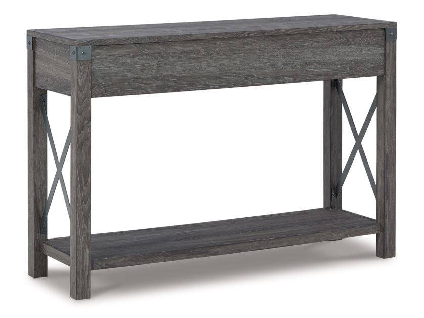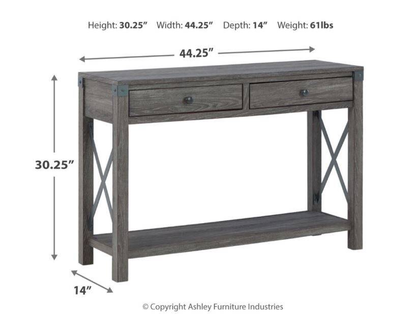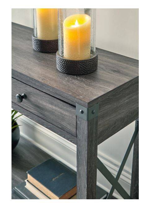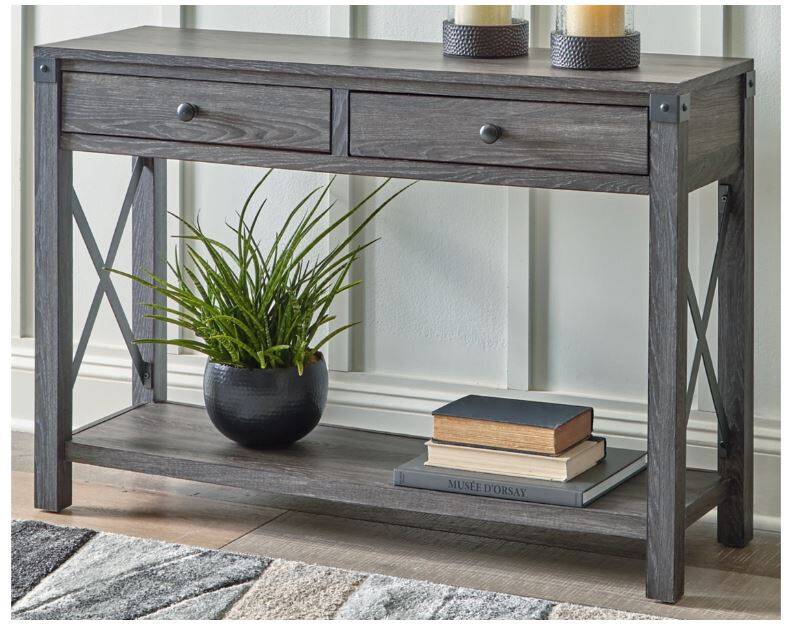 Open the door to modern farmhouse style with the Freedan console table. The beautiful woodgrain look and classic crossbuck metal accents are a cool touch, while the lower shelf provides surface space for fashionable home accessories. A pair of smooth-gliding drawers is the answer to the daily, where-are-my-keys question.