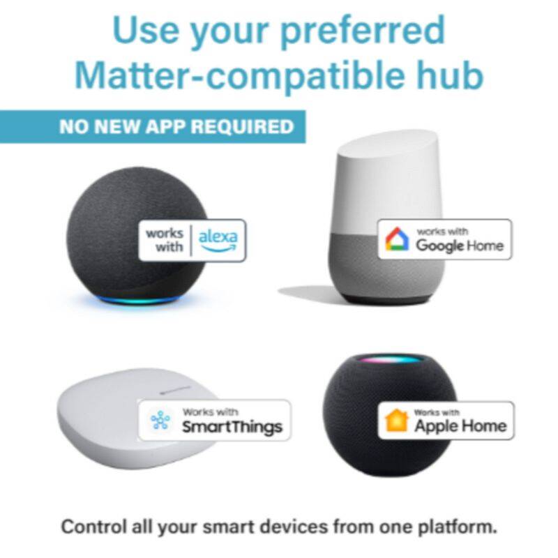 | Works With | Amazon Alexa, Apple Home, Google Home, Matter, Samsung SmartThings |