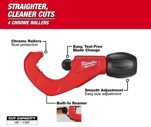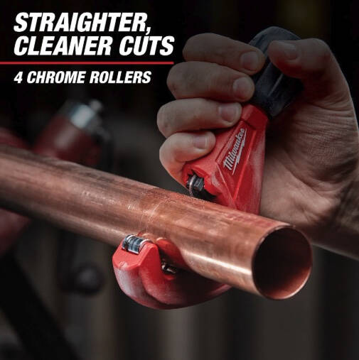The Milwaukee 1-1/2 inch Constant Swing Copper Tubing Cutter is engineered for straighter, cleaner cuts. A 4 Roller Design delivers accurate cuts and prevents walking. For added durability and extended performance, Chrome Rollers provide best in class rust protection. An On-Board Reamer enables fast, easy debarring.
