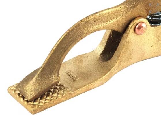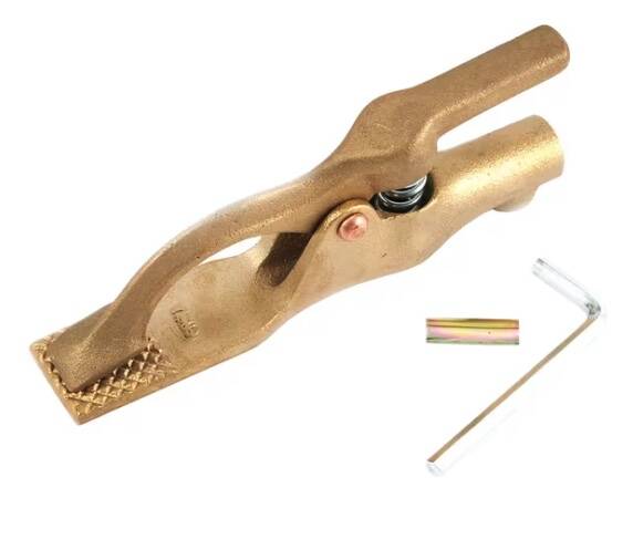 This Forney 300 AMP heavy-duty brass ground clamp is 7-3/8 inch (187.3 mm) long with a 1-1/2 inch (38.1 mm) jaw opening. It Includes a shim stock and wrench, accepts up to #2 welding cable and has wide grooved jaws with a large contact area that assures positive grounding. Additionally, this ground clamp has oval-point screw cable connections which make installation easy, assuring good, safe cable connections.