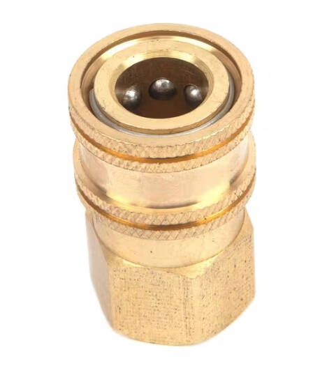 Brass pressure washer coupler socket with 1/4 inch (6.35 mm) Female National Pipe Thread (MNPT) end and 1/4 inch (6.35 mm) female quick connect coupler end. Used anywhere high-pressure connections are frequently assembled and disassembled. The quick connect coupler sockets connect to all the most common pressure washer equipment in the industry.