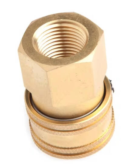 Brass pressure washer coupler socket with 3/8 inch (9.53 mm) Female National Pipe Thread (MNPT) end and 3/8 inch (9.53 mm) female quick connect coupler end. Used anywhere high-pressure connections are frequently assembled and disassembled. The quick connect coupler sockets connect to all the most common pressure washer equipment in the industry.