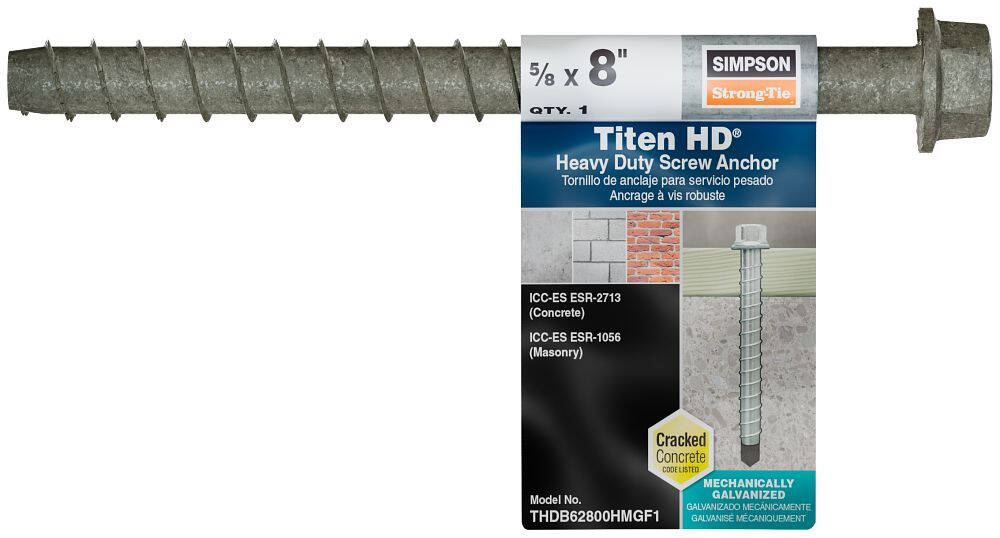 The Titen HD heavy-duty screw anchor is a mechanically galvanized high-strength screw anchor for use in cracked and uncracked concrete, as well as uncracked masonry. Its proprietary heat treatment and ASTM B695 Class 65 mechanically galvanized coating make it ideal for both interior and exterior anchoring applications.
