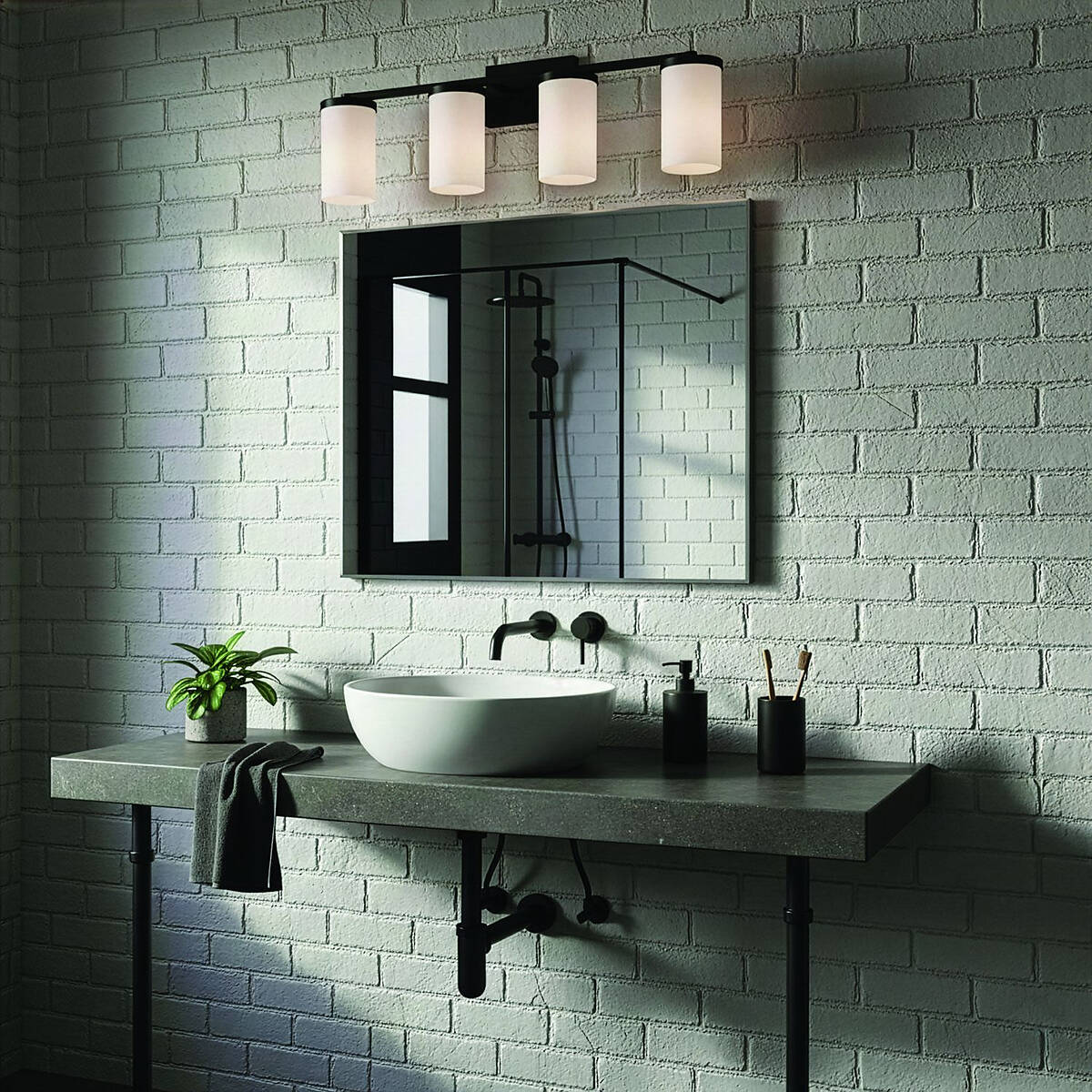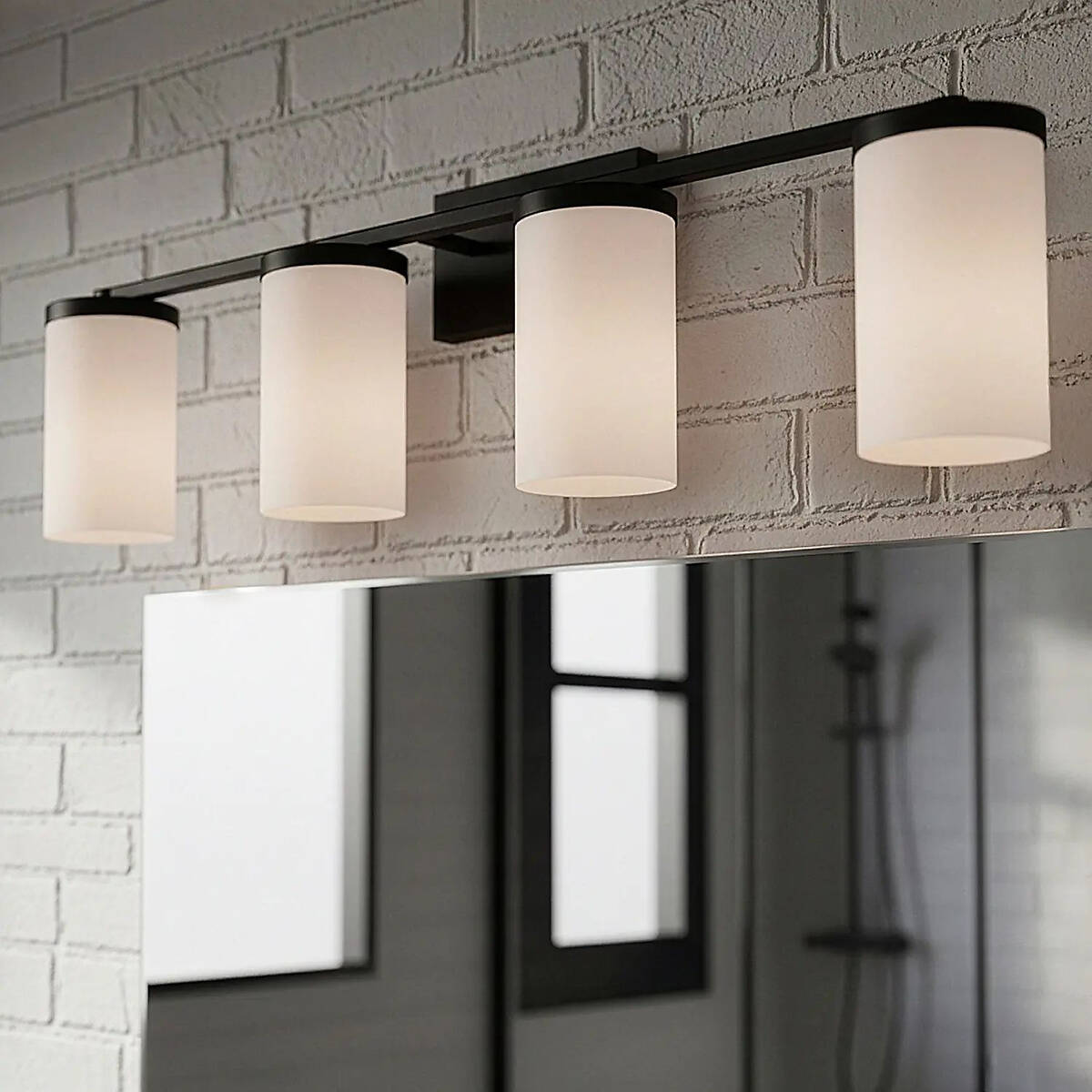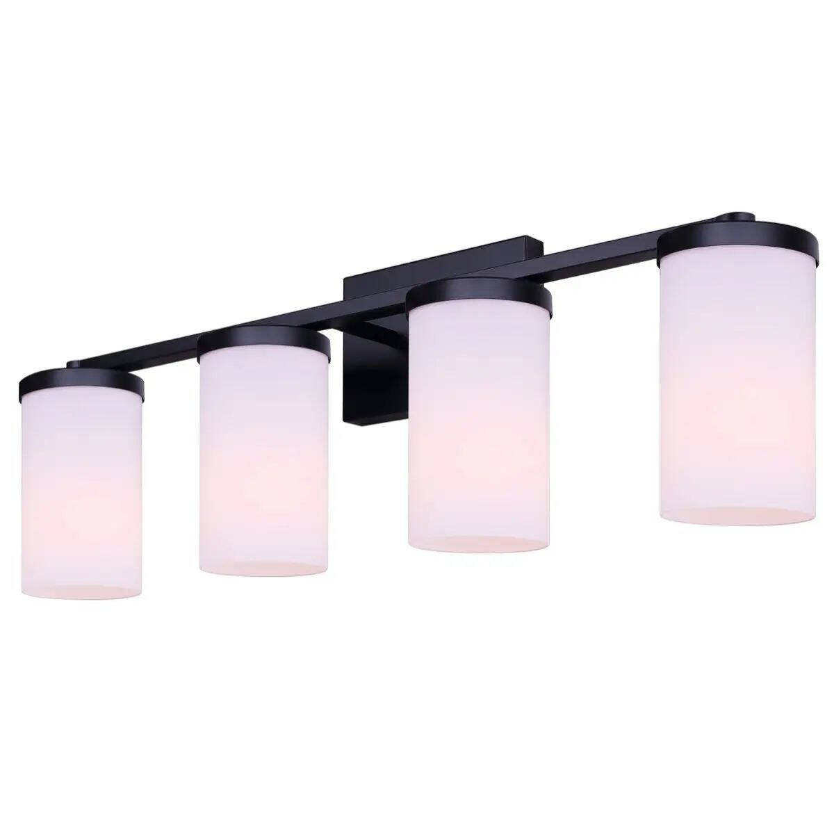 The BRITTON 4-light vanity combines modern style with reliable, builder-friendly performance, making it ideal for any bathroom project or remodel. Its matte black finish and four opal glass shades create clean, contemporary lines while providing bright, even illumination for grooming, makeup, or daily routines. Designed for 100W Type A bulbs (not included), BRITTON delivers ample light while maintaining a streamlined, versatile profile. Measuring 28 inches wide, 9.62 inches high, and 6.12 inches deep, it fits effortlessly above single- or double-vanity sinks and accommodates a variety of bathroom sizes. Built for lasting performance and easy installation, this fixture is perfect for both DIY projects and professional builds. With its balance of modern elegance and functional design, BRITTON enhances any space with polished style and dependable reliability.