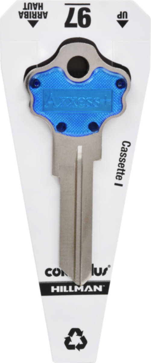 The HILLMAN #97 Colorplus Key is a blank key designed for anyone who needs a ready-to-cut replacement or duplicate. Finished in a bright blue for easy identification on a keyring or in a drawer, this blank lets locksmiths, homeowners and property managers quickly match and cut a working key to fit the corresponding lock profile. Its compact dimensions — 2.35 inches wide, 3.7 inches high and 1.3 inches long — make it a familiar, easy-to-handle size for standard key machines and everyday carry. The EZ No. #97 stamping helps ensure you select the correct blank before cutting, streamlining key copying for doors, cabinets or other keyed hardware that use this profile. A simple, color-coded blank built for convenient identification and accurate duplication.