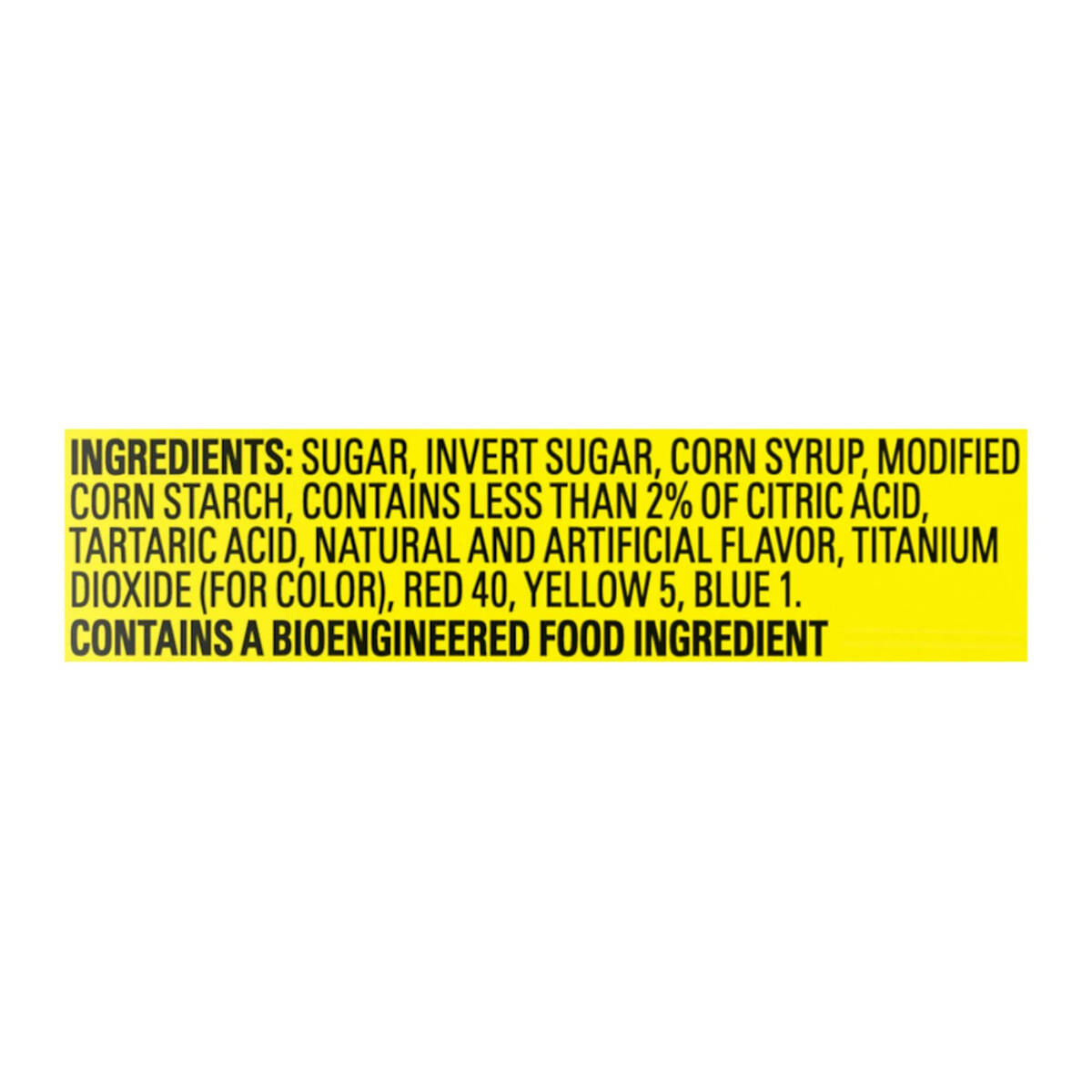 | Ingredients | Sugar, Invert Sugar, Corn Syrup, Modified Corn Starch, Contains Less Than 2% Of Citric Acid, Tartaric Acid, Natural And Artificial Flavor, Titanium Dioxide (For Color), Red 40, Yellow 5, Blue 1. |