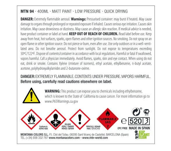 It has never before been so easy to paint with aerosol. Its smooth valve system makes 94 an extremely easy aerosol paint to handle. Its ability to dry quickly prevents drips and also allows for almost immediate repainting. However, one of the most important aspects of the 94 range is its wide array of high opacity colors. The ample selection will make it easy for you to find the optimal tone to suit your needs. **See color chart for the listed color