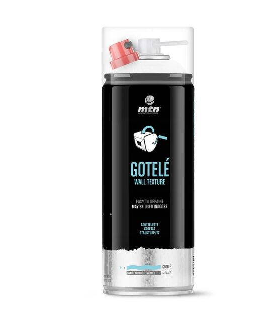MTN PRO Gotelé Wall Texture Spray imitates the gotele/stucco effect. This product is a spray paint containing a product formulated with an exclusive polyurethane output, which imitates the structure of gotele in an easy and simple manner. Ideal for renovating and repairing these types of stuccos. This product may be applied to a multitude of surfaces such as concrete, drywall, wood, etc. and can be repainted with all types of wall paints.