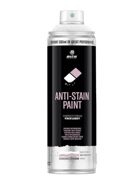 MTN PRO Anti-Stain Spray Paint is an acrylic paint made to cover stains on ceilings or walls. This paint is formulated with high-quality acrylic resins, titanium dioxide, and additives. The result is a high coverage paint that is perfect for long-lasting, quick coverage of stains on walls. Due to the characteristics of this product we recommend using it for final finishes or as a base coat for other paints.