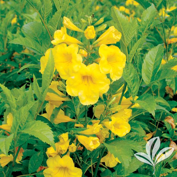 A variety that grows 6 to 7 ft tall and wide. Golden yellow trumpet-shaped flowers are lightly fragrant and bloom profusely from summer to frost. Excellent specimen for foundation planting, container shrub, or tropical accent.