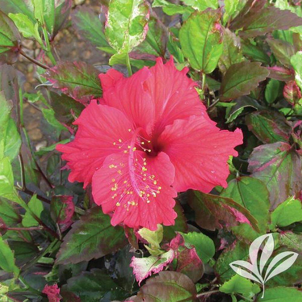 Vibrant red, single Hibiscus flowers bloom throughout the summer. The brilliantly variegated foliage is randomly splashed in shades of green, white, burgundy, red, and pink. Grows 3 to 6 ft tall and wide. Excellent in containers or as a colorful specimen.