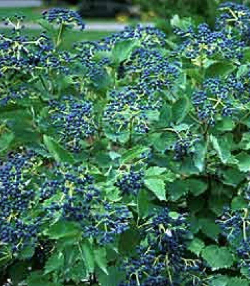 White bloom clusters, followed by berries of brightest blue, nestled among dark shiny green foliage. Heavier fruit production when planted with other dentatums. Proven Winners.