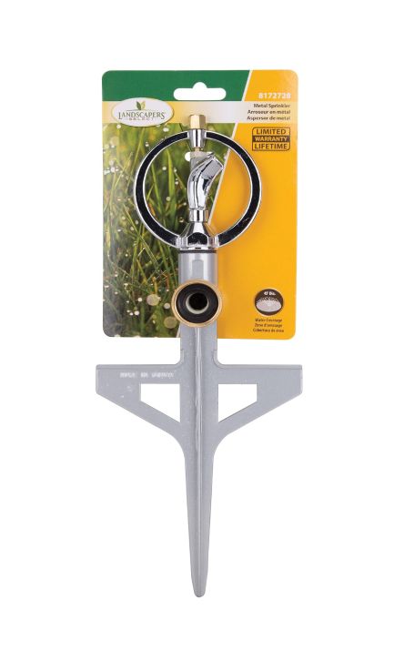 Two spike with brass 3/4 in female swivel and plastic cap end. Brass and zinc alloy head. Plated finish and durable construction. Coverage area is 45 ft Dia.
