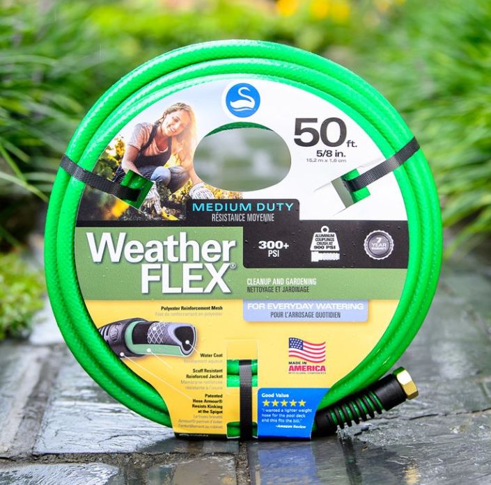 Swans WeatherFLEX® all-weather hose is a medium-duty garden hose perfect for everyday watering tasks such as watering the garden, watering the lawn and general cleanup. With a 5/8-inch inside diameter and strong 300+ PSI burst strength, the WeatherFLEX® water hose delivers just the right amount of water at the right speed for all of your outdoor needs.