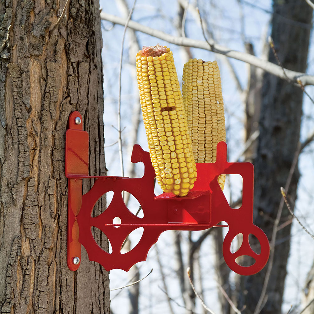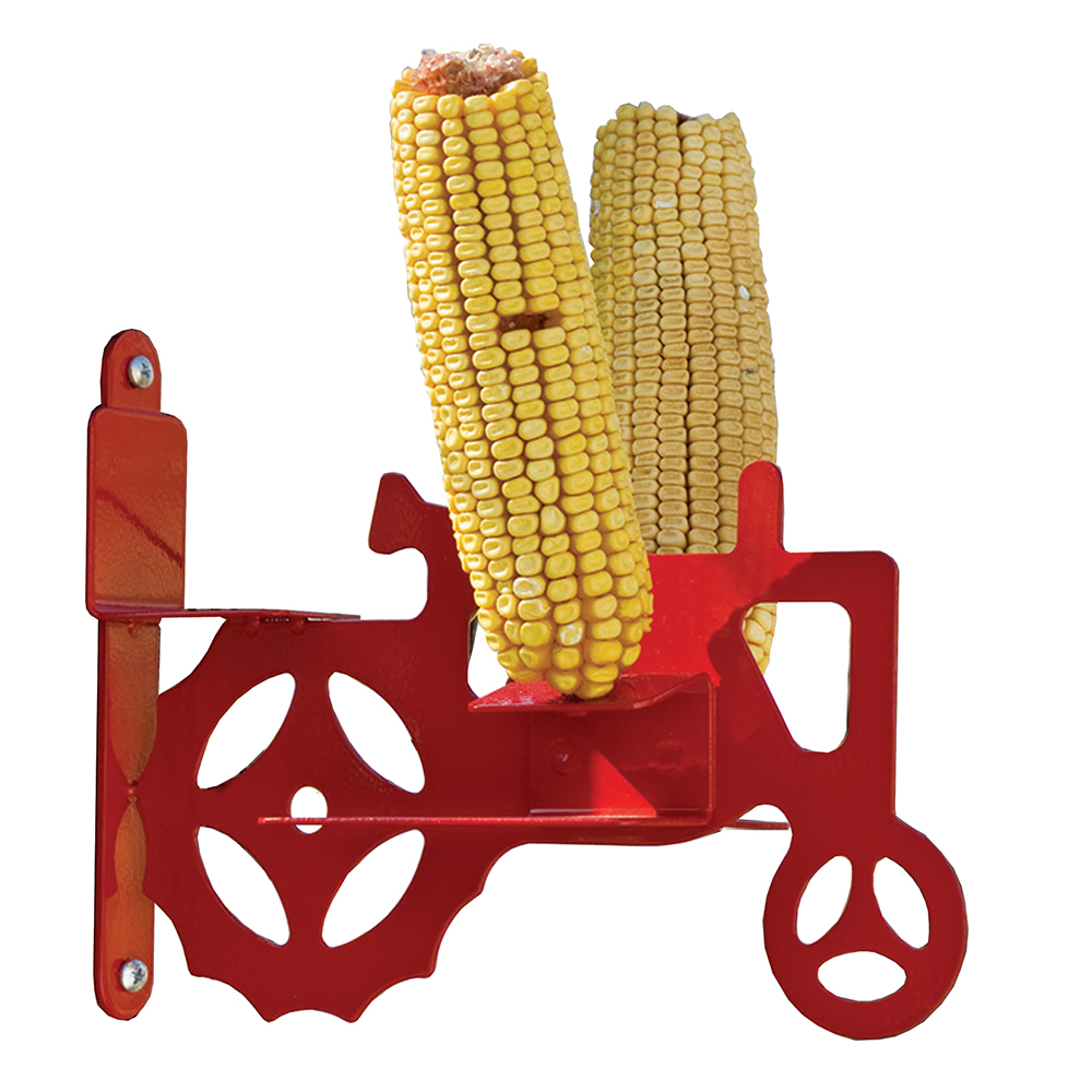 Have fun watching squirrels entertaining antics with the More Birds® Tractor Cob Feeder! The Tractor Cob Feeder holds 2 ears of corn and provides plenty of space for squirrels to sit and eat away as they look like theyre driving a miniature tractor. This high-quality, tree-mount feeder is constructed of durable metal, coated with a red polyester finish to keep it weather-resistant. And its not just for squirrels! The Tractor Cob Feeder is also perfect for placing sliced oranges on the spokes to attract orioles and other fruit-loving birds.