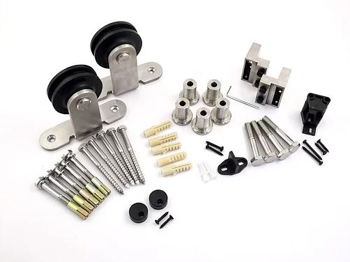 The set includes 2 stainless steel top mounts, a rail, and all mounting hardware needed for one door. The high-density plastic wheels provide a smooth, quiet operation for classic barn door look.