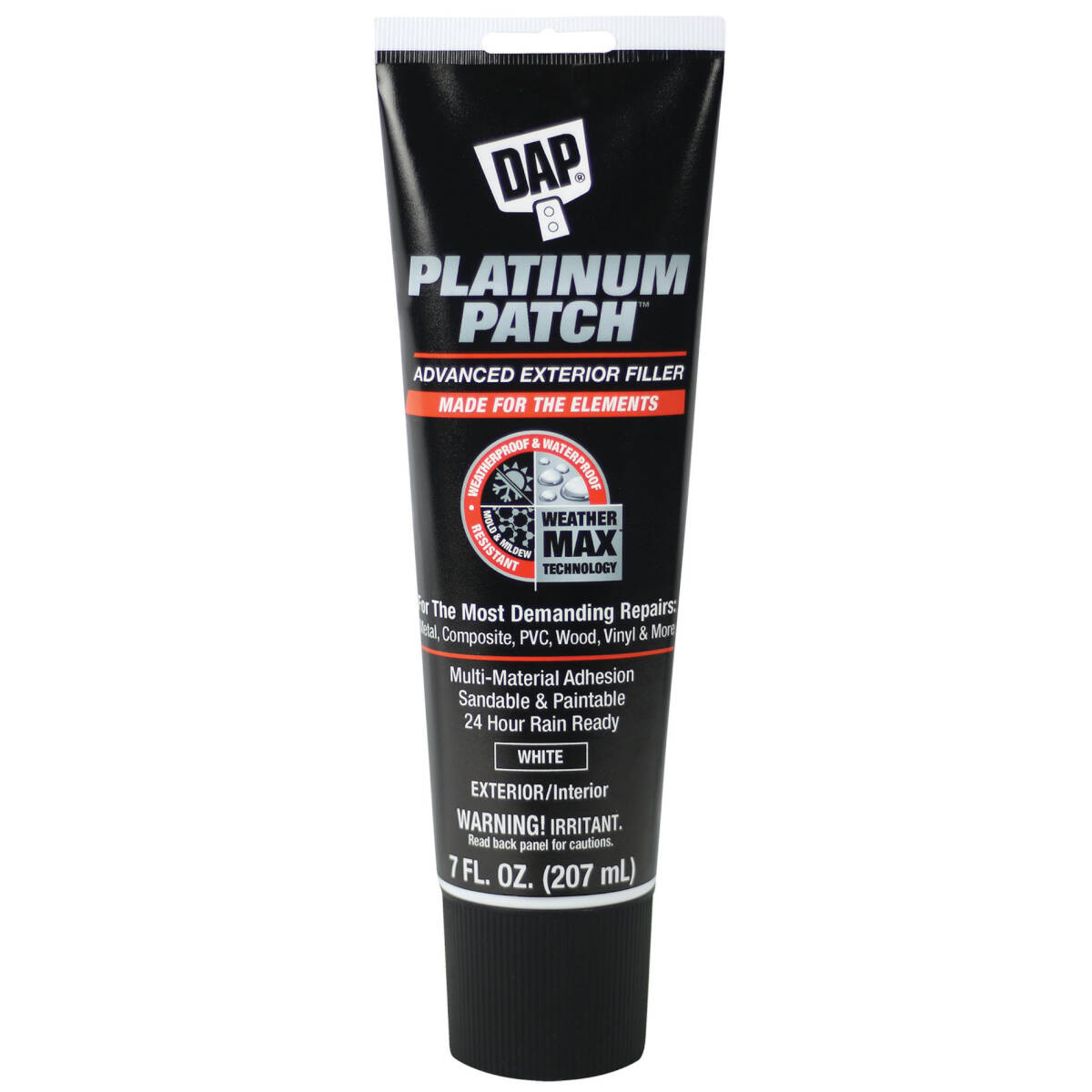 Platinum Patch™ advanced exterior filler is formulated with innovative weather max technology for long-lasting, all-weather protection. Platinum Patch provides exceptional weatherproof protection that prevents discoloration, cracking and crumbling. The tough hydrophobic surface provides a waterproof repair that won't swell, soften, blister or breakdown and it is mold, mildew and algae-resistant making it ideal for areas with continuous exposure to the elements. It has strong multi-material adhesion to tough porous and non-porous materials making it ideal for exterior applications such as the installation, finishing or repairing of fiber cement siding, PVC trim board, vinyl siding, metal, composite, concrete, brick, wood and more. Platinum Patch creates a strong, durable bond that won't crack or lose adhesion over time and is also is sandable, paintable, easy water clean-up and low in odor. Exterior/interior use.