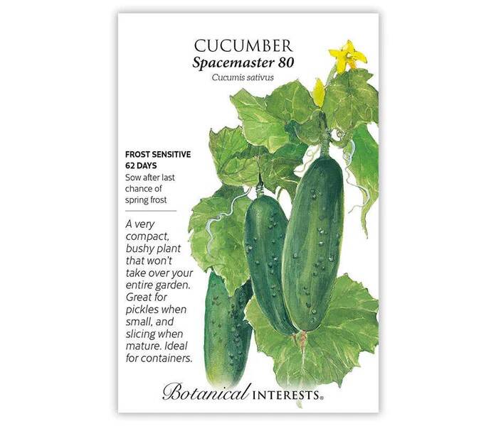 Has your garden ever been overrun by cucumber plants? 'Spacemaster 80' is the solution! Its 2'–3' vines make it the ideal choice for small growing areas including containers. It produces large numbers of flavorful, full-sized slicing cucumbers, perfect for snacking, salads, and sandwiches, and even for pickling when harvested small. Disease resistant.
