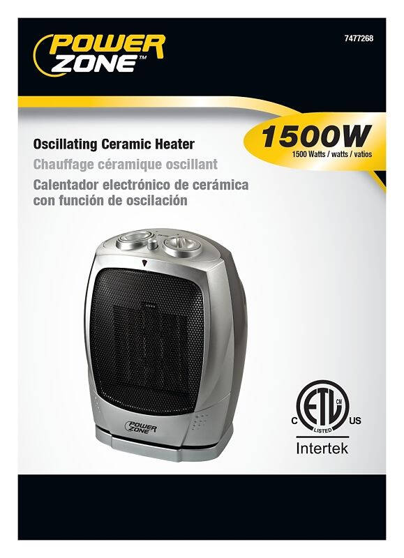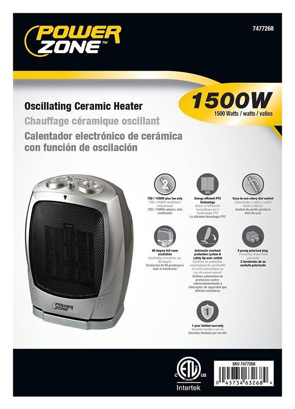 Features 750W/1500W heat settings plus fan only. Energy-efficient PTC technology. 90 degree full room oscillation. Auto-matic overheat protection system & safety tip-over switch. 2-prong polarized plug. ETL and cETLus.