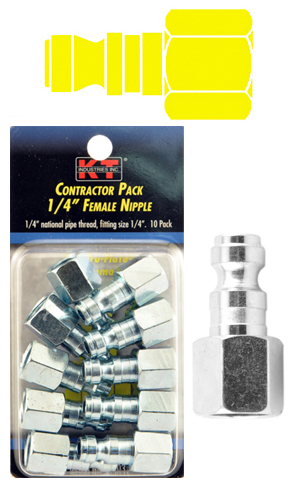 Tru-Flate® style 1/4 in female nipple contractor pack. Contains ten zinc plated, steel nipples. All of the same high quality standards found in the individual pack in a money-saving contractors' package.