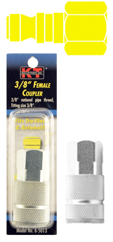 3/8 in female national pipe thread 3/8 in coupler. Interchangeable with most Automotive Standard series couplers and plugs produced by other manufacturers. Features zinc plated solid brass bodies and sleeves with stainless steel springs, hardened steel locking balls and valves, and Buna-N (Nitrile) seals. Precision machined bar stock construction provides resistance to the effects of mechanical shock in rugged applications.