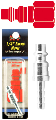 1/4 in barbed 1/4 in nipple. Interchangeable with most Automotive Standard series couplers and plugs produced by other manufacturers. Nipples are zinc plated steel with hardened wear points. Precision machined construction provides resistance to the effects of mechanical shock in rugged applications.
